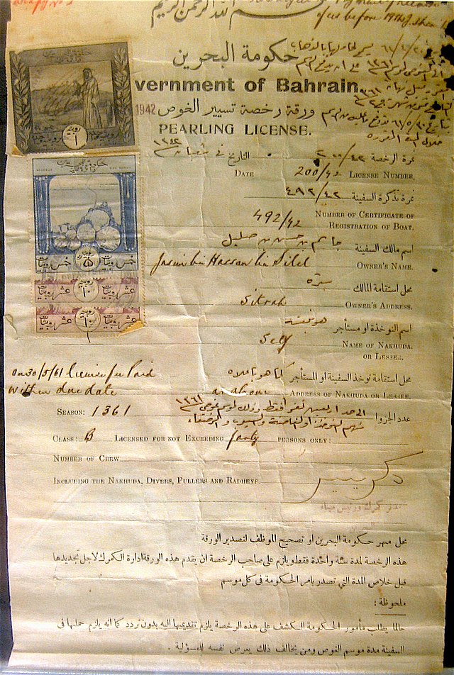 ورقة رخصة تسيير الغوص اسم مالك السفينة جاسم بن حسن بن صليل محل استقامة المالك ستره ، كما توضح عدد الجزوا الي اربعين نفرا فقط وذلك لموسم غوص 1361 هـ .