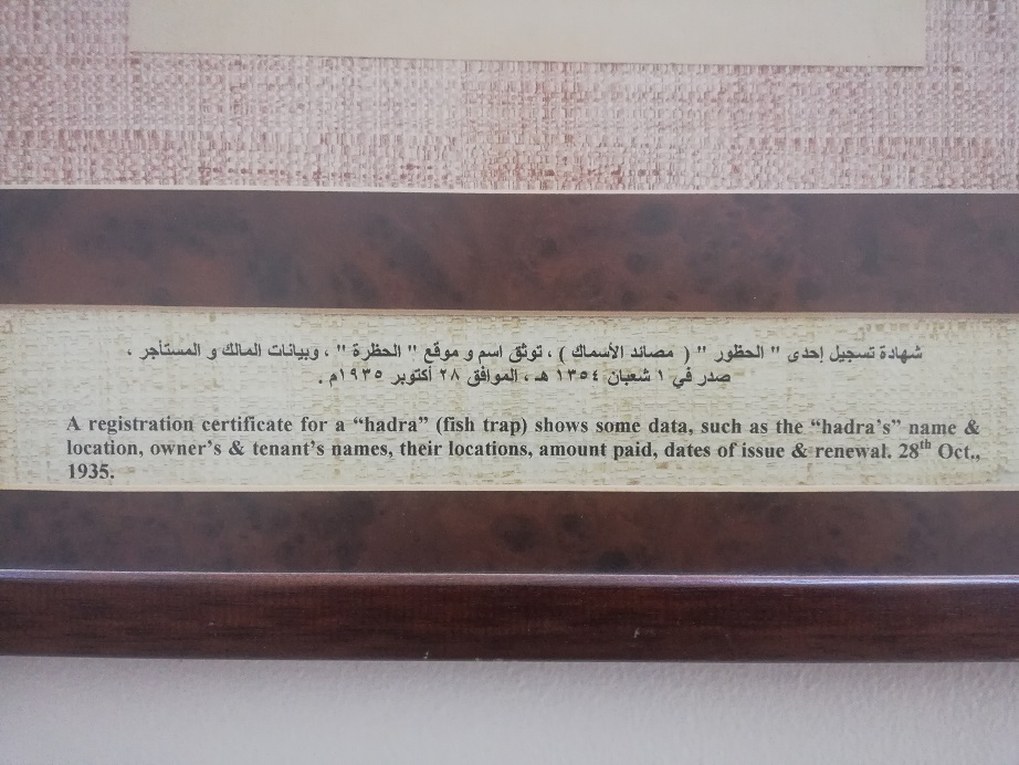 شهادة تسجيل إحدى الحضور ( مصائد الاسماك ) ، توثق اسم وموقع وبيانات المالك والمستأجر . المالك عبدالله بن صالح المناعي المستأجر حسن بن حمد قلالي