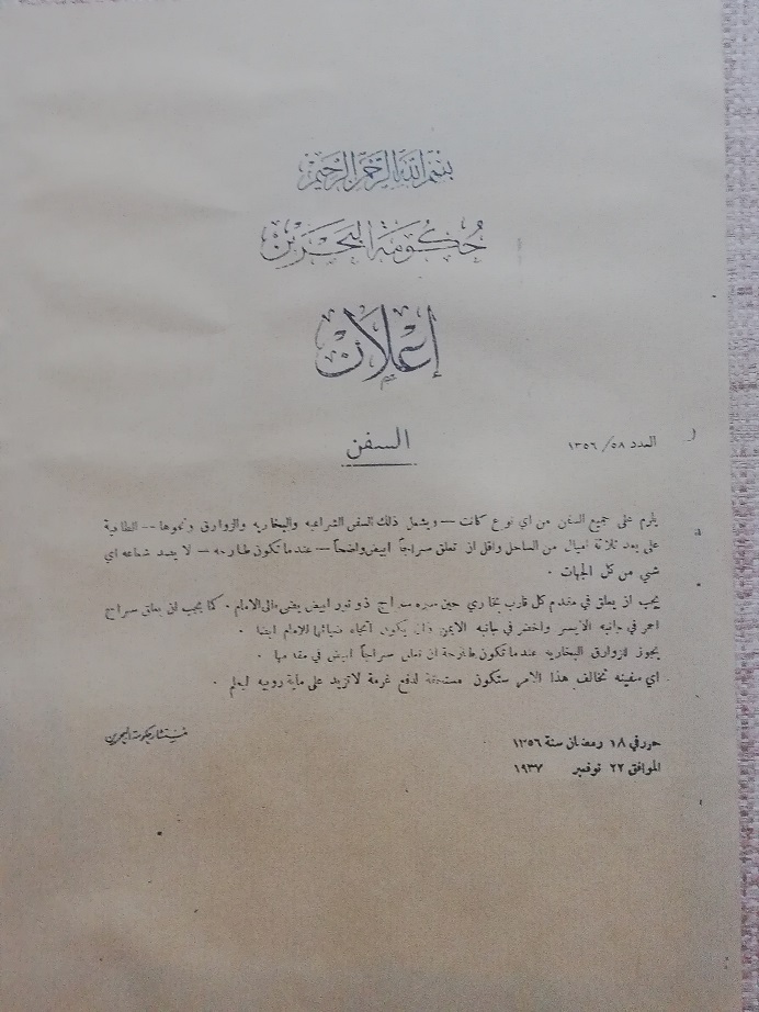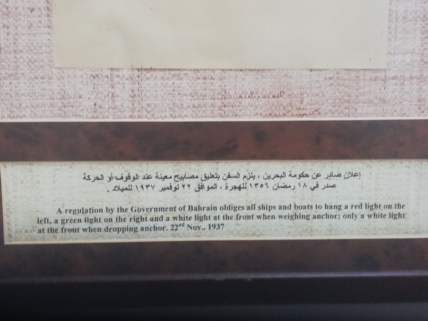 اعلان صادر عن حكومة البحرين يلزم السفن بتعليق مصابيح معينة عند الوقوف او الحركة