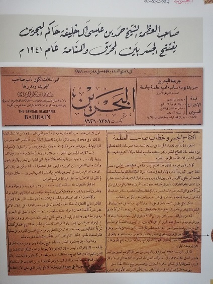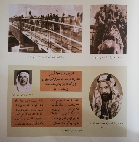 كلمة صاحب العظمة الشيخ حمد بن عيسى ال خليفة حاكم البحرين حيث قال نشكر ممثلي بلديتى المنامه والمحرق . وقد توقف البناء 3 سنوات وذلك لسبب نقص الميزانية ... وقد كان التشييد تحت اشراف خانصاحب محمد خليل مدير دائرة الطابو الذي كان مسؤولا عن الاشغال العامة وفي سنة 1937 اوجدت دائرة منفردة للاشغال العامة مديرها المستر محمد جعفر ، فمهد اليها اتمام الجسر . ولو انه قد مضي 13 سنة منذ اول حجر ، فقد بوشر العمل 10 سنوات . بلغت تكاليف الجسر من الحجر 2,75,000 روبية مائتين وخمسا وسبعين الف روبيه او 20000 جنيه تقريباً وذلك قيمة الاحجار التي قطعها من البحر رجال بحرينيون وأتت به الي الشاطئ من بحرينيه واجور عمال اشتغلوا فيه ، لذا يمكن يقال بحق ان هذه الدراهم صرفت في البحرين وانتفع بها مباشرة اهالي البحرين خلال سنوات لم تكن فيها الاعمال رائجة نظرا لرداءة مواسم الغوص . اما الجزء المتحرك فقد كلف 4,25,000 روبية اربعمائة وخمسا وعشرين الف روبيه او 32000 جنية تقريبا ومعظم هذا المبلغ صرف محليا لاجور عمال ومواد .....