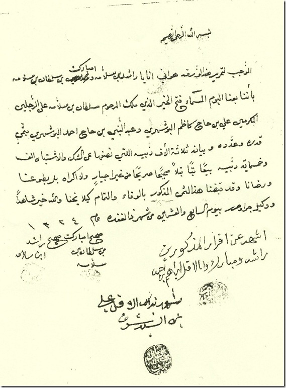 "بسم الله الرحمن الرحيم الموجب لتحرير هذه الورقة هو اني انا يا راشد بن سلامة وامبارك بن سلطان بن سلامة بأننا بعنا البوم المسماء فتح الخير الذي ملك المرحوم سلطان بن سلامة على الرجلين المكرمين علي بن حاج كاظم البوشهري وعبدالنبي بن حاج احمد البوشهري بثمن قدره وعدده وبيانه ثلاثة آلاف ر بّيه التي نصفها عن الشك والاشتباه الف وخمسماية ربّيه بيعا بتاً بتلاً صحيحاً صريحاً في غير اجبار ولا اكراه بل بطوعنا ورضانا وقد قبضنا هذا الثمن المذكور بالوفاء والتمام كيلا (يخنا؟) والله خير شاهداًووكيل جرا وحرر بيوم السابع والعشرين من شهر ذا القعدة عام 1324. اشهد عن اقرار المذكورين راشد ومبارك وانا الاقل ابراهيم بن احمد (الختم) صحيح امبارك بن سلطان بن سلامه صحيح راشد (الختم) ابن سلامه (الختم) شهد بذلك الاقل علي بن السيد شرف (الختم)