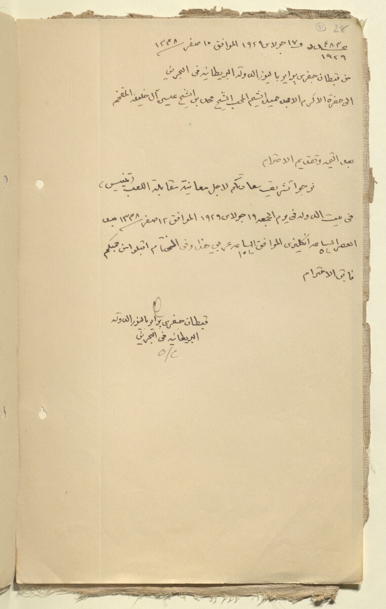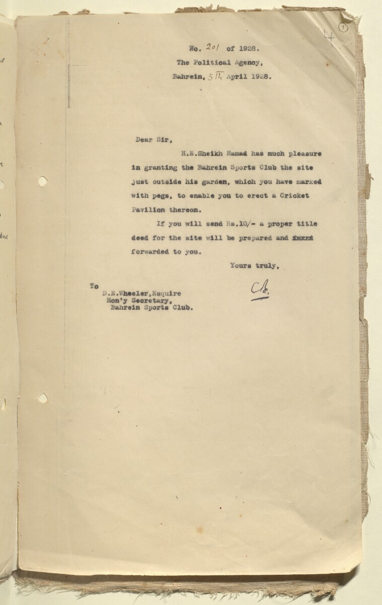 مراسلات مؤرخة ١٩٢٨ إلى ١٩٢٩ فيما يتعلق بتوفير أراضي أو مباني لمنشآت النادي، بما في ذلك الأراضي المجاورة لمستشفى فيكتوريا التذكاري، ومبنى تخديمي للكريكيت، وملاعب تنس في حدائق البلدية، واستئجار مبنى لاستخدامه كمكان لاجتماع أعضاء النادي؛